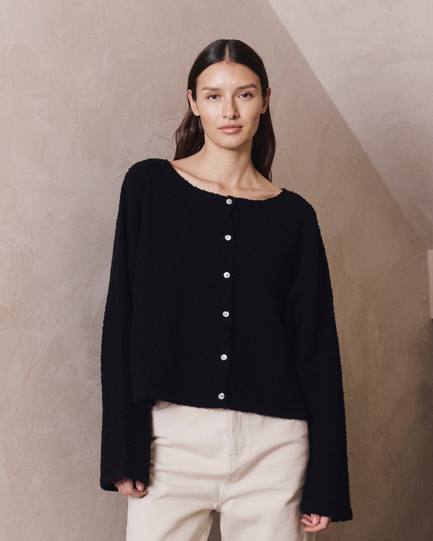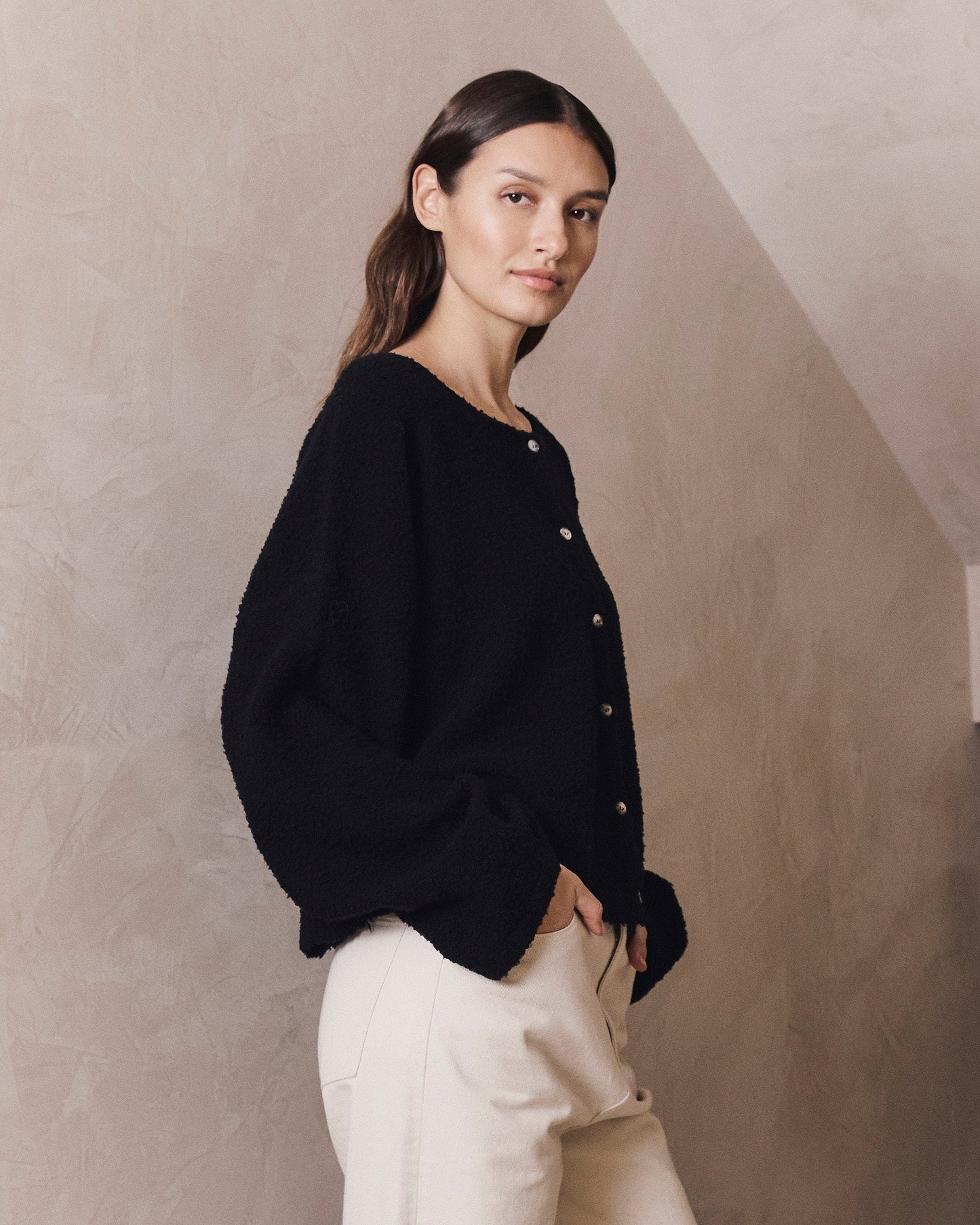 Den INÉZ Cardigan empfehlen wir von Hand in einem Waschsack zu waschen, liegend zu trocknen und bei niedriger Temperatur zu bügeln. Er ist nicht Trockner geeignet.